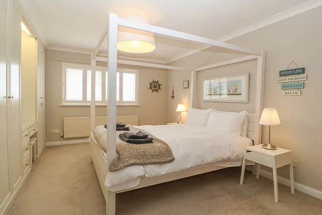 There are four stylish bedrooms at this superb Trearddur Bay cottage, including a king-size master room with a four poster bed and en-suite shower room, a double with feature mural, a twin, and a bedroom with bespoke 'quad podÂ’ bunk beds sleeping four. A large double garage can be used for the storage of watercraft and mountain bikes.