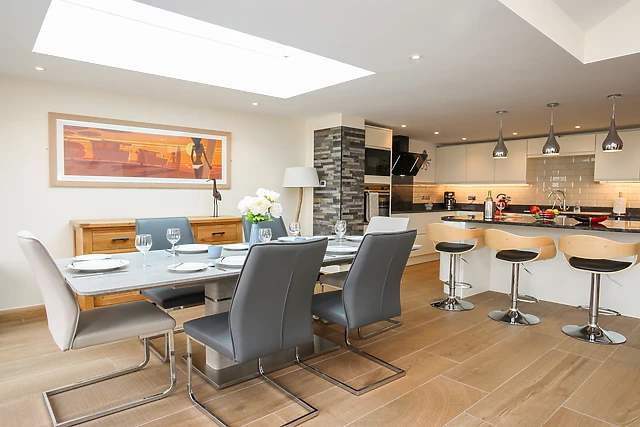 Indulge in the open-plan living space where light floods through, creating a warm and inviting atmosphere. The sleek kitchen is equipped for culinary adventures, while the plush seating area invites you to unwind in front of the woodburning stove.