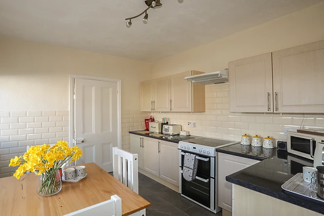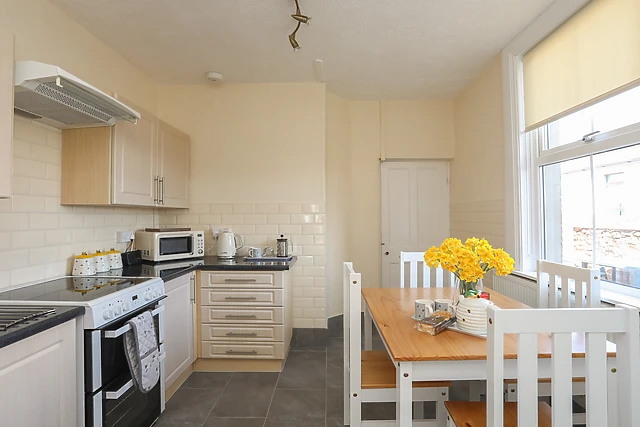 The well-appointed kitchen and dining area provide everything needed to create delicious meals, with the option to dine al fresco in the enclosed garden.
