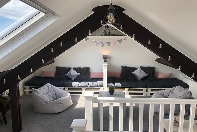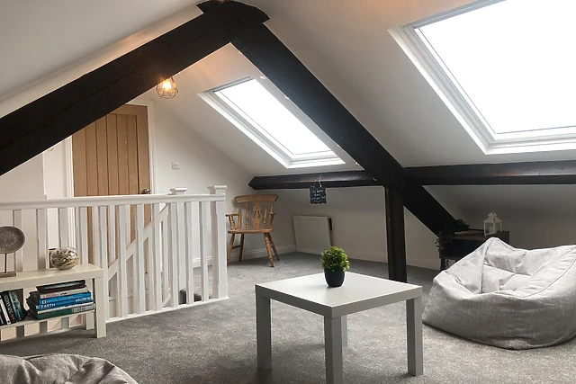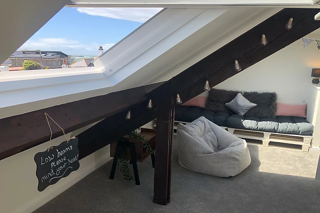 The third floor of the cottage boasts a large room for relaxation where you can unwind with one of the many provided books and enjoy the glimpses of the sea out of the large windows. Also on the top floor is an additional large bedroom with striking feature beams.