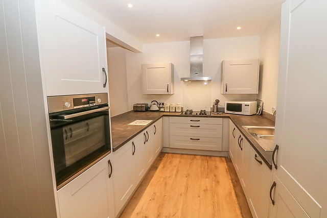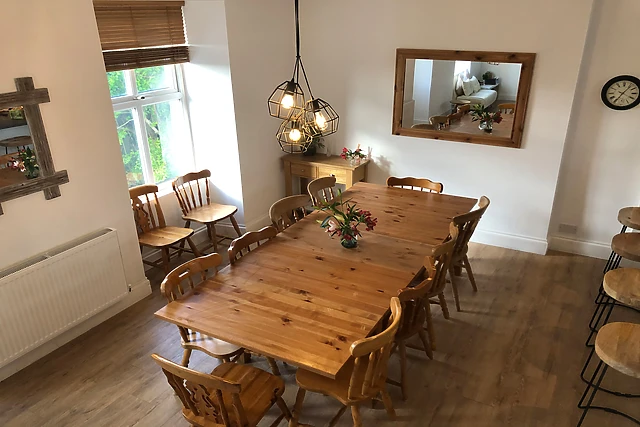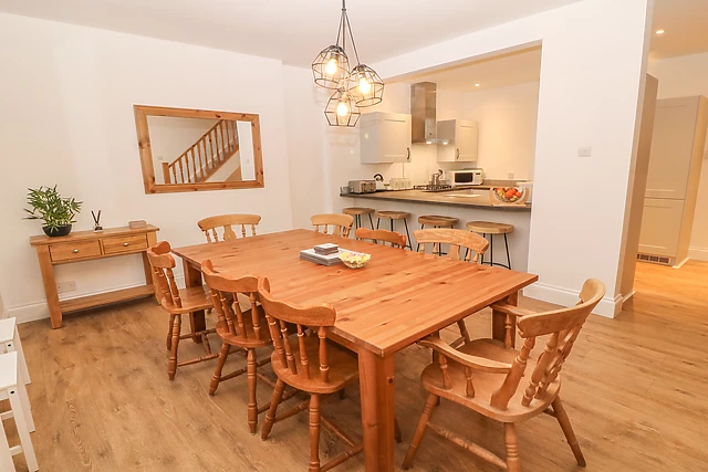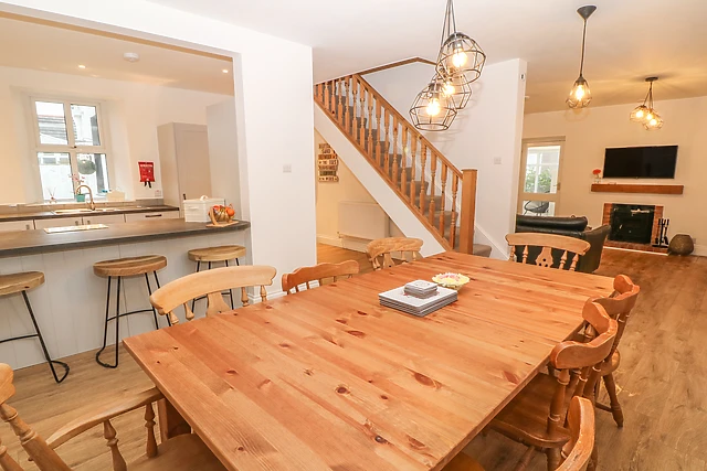 The cottage has a spacious interior, arranged over three floors with the top floor of the property enjoying glimpses of both the Irish sea to the right and the Inland sea to the left, through the large velux windows. On the ground floor the kitchen has plenty of worktop space and cupboards, and all appliances are integrated with the addition of a very useful breakfast bar and dining area with seating set up for ten people.