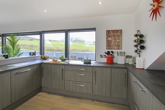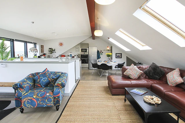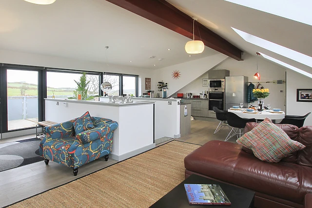 The modern kitchen is well-equipped with a double oven, hob, dishwasher, washer/drier, microwave, and toaster, catering to all your culinary needs during your stay.