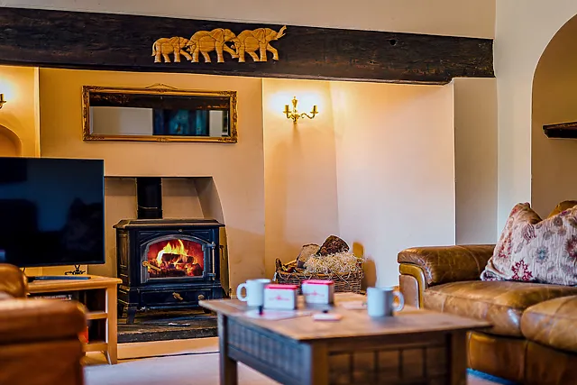 The cottage boasts a spacious living and dining area with a wood burner, perfect for relaxing evenings.