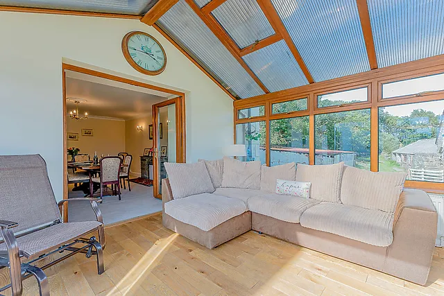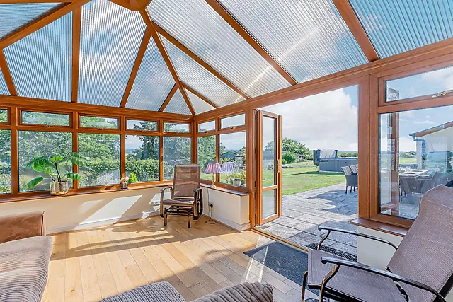 Inside, the property exudes rustic charm with a well-equipped farmhouse kitchen, a cosy lounge with a wood burner, and a bright conservatory for relaxation.