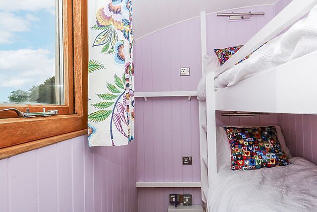 The kitchen, with its blue fixtures and wooden countertop, is ideal for preparing relaxed meals to enjoy at the folding dining table, warmed by the glow of the woodburning stove. Sleeping arrangements include a king-size bed and a bunk bed strictly for children, offering a restful space for families to settle in after a day of adventure.