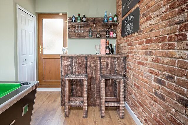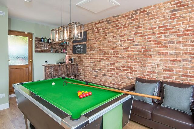 The open-plan living area is designed for socialising and relaxation, featuring a cosy sofa and armchairs, a dining table that seats ten, and a fully equipped kitchen. The downstairs games room, complete with a pool table and bar, adds an extra layer of fun to your stay.