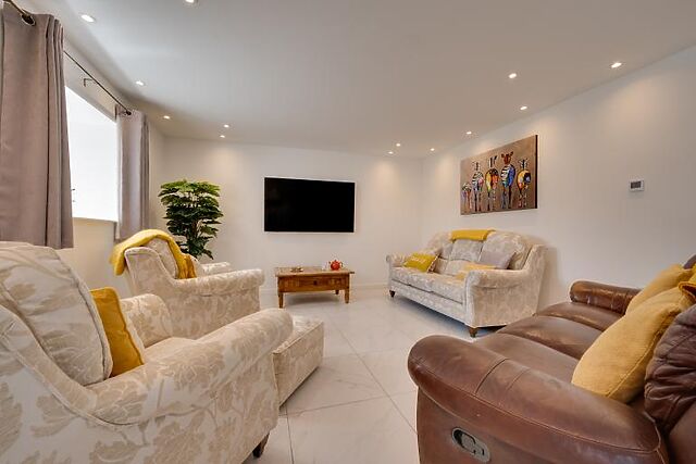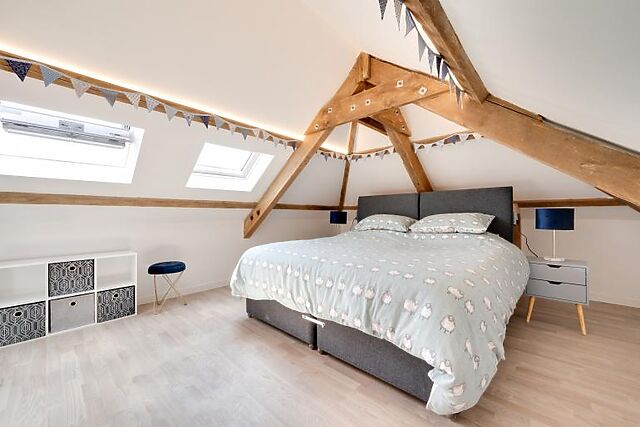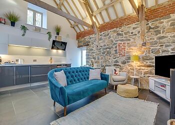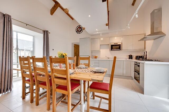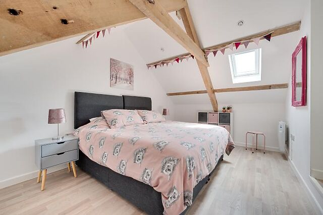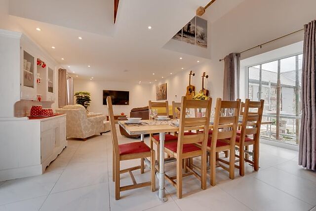 The open-plan living area is a highlight, featuring high ceilings, spotlights, and fresh white walls. The well-equipped kitchen and cosy lounge area with a Smart TV make it an ideal spot to relax. The ground floor includes a versatile super-king-size zip-and-link bedroom, while the first floor houses two more zip-and-link bedrooms and a twin bedroom with exposed beams.