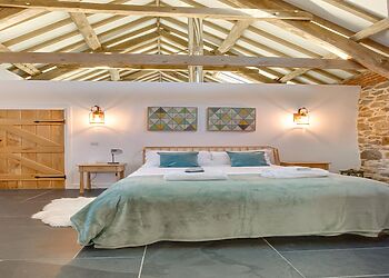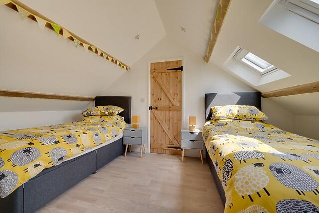 The ground floor includes a versatile super-king-size zip-and-link bedroom, while the first floor houses two more zip-and-link bedrooms and a twin bedroom with exposed beams.