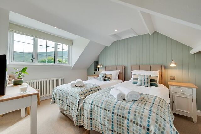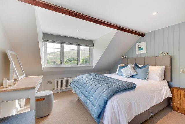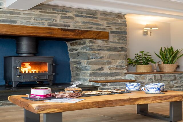 Outside, the garden offers a hot tub with a lockable enclosure, a gas BBQ, and a casual seating area with an outdoor fireplace. Children will love the lawned play area and nearby 'tiddler' stream, providing hours of entertainment.