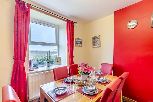 The enclosed garden at the rear of the cottage boasts a hot tub with stunning views towards the sea and hills. There's also a BBQ and seating area, perfect for summer evenings.