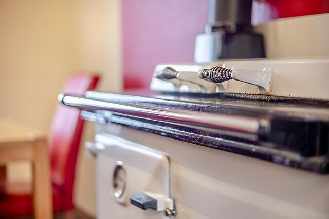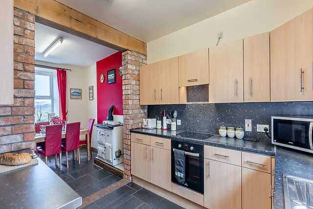 The cottage features original wood floors and exposed ceiling beams, adding to its cosy atmosphere. The well-equipped kitchen includes a Rayburn and an oven, and the large oak dining table overlooks the garden.