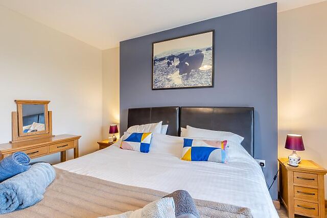 Upstairs, you'll find four bedrooms with solid oak furniture. Two bedrooms have super-king-size zip-and-link beds that can be arranged as twins, while the other two have small double beds for single occupancy.