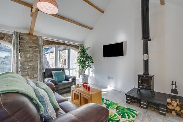 Inside, you'll find a light-filled open-plan lounge and dining area with a comfortable sofa, chair, and a cosy wood burner for those chilly evenings.