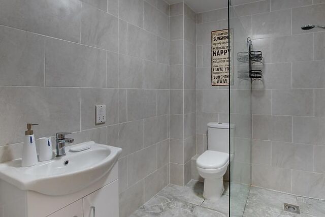 The dining area, next to the well-equipped kitchen, features a table and chairs, perfect for intimate meals. The luxurious bedroom boasts a super-king bed that can be converted into two twin beds, and the bathroom includes a large power shower.