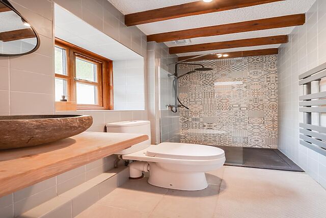 Inside, you'll find open-plan kitchen and living areas that are ideal for family gatherings and cosy evenings. The decor combines exposed stone walls with contemporary furnishings, creating a warm and inviting atmosphere.