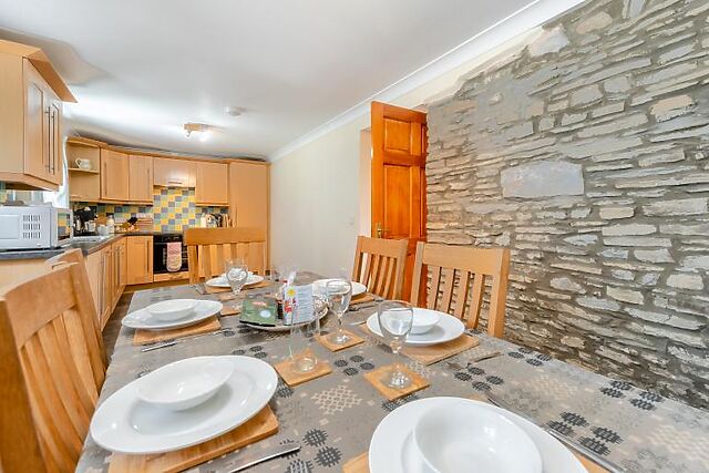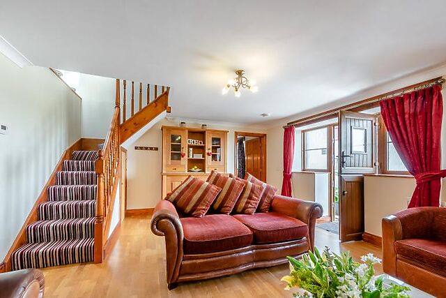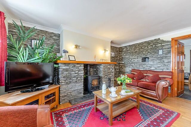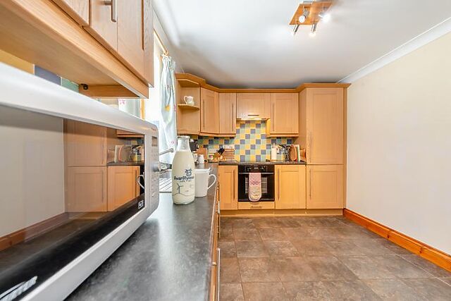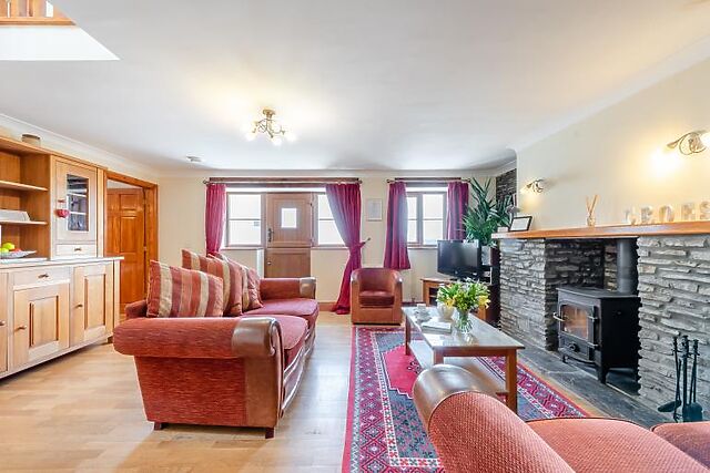 The ground floor offers a spacious sitting room with oak flooring and a woodburner. The well-equipped kitchen includes modern appliances, making it easy to prepare meals.