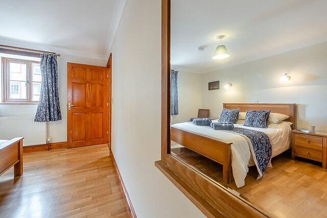 The ground floor offers a spacious sitting room with oak flooring and a woodburner. The well-equipped kitchen includes modern appliances, making it easy to prepare meals. A ground floor bedroom with a king-sized bed and en-suite shower room ensures accessibility for all guests.