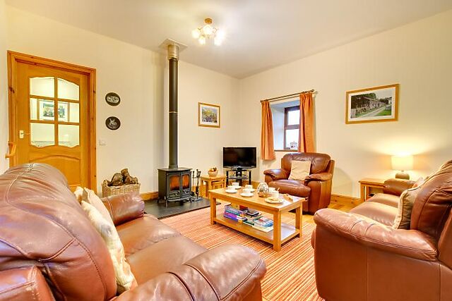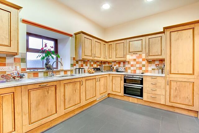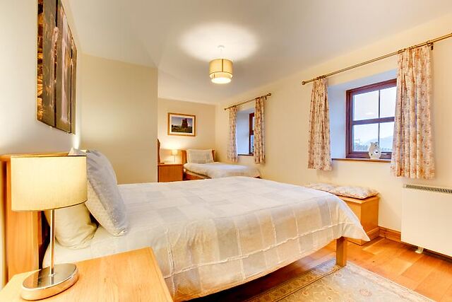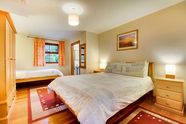 You'll find two king-size bedrooms, each with an additional single bed and a TV. One bedroom has an en-suite shower room, while the other shares a family bathroom. The open-plan kitchen, lounge, and dining area is ideal for family meals and cosy evenings by the wood burner.