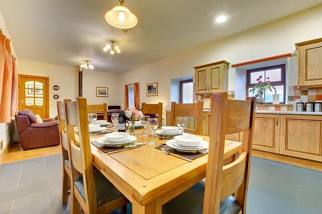 The open-plan kitchen, lounge, and dining area is ideal for family meals and cosy evenings by the wood burner.