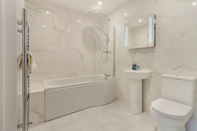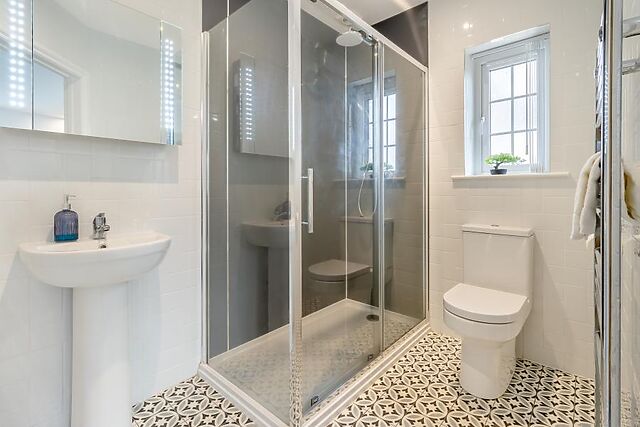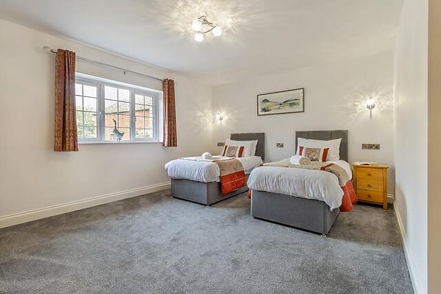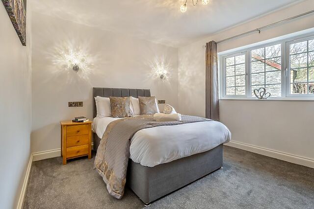 The property boasts three bathrooms, including en-suites, providing convenience for all guests. Outside, the enclosed garden offers a peaceful setting for alfresco dining or a soak in the hot tub.
