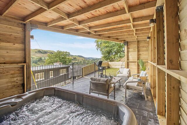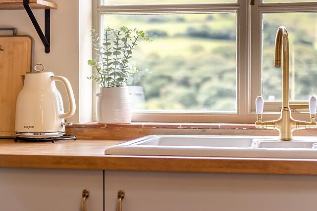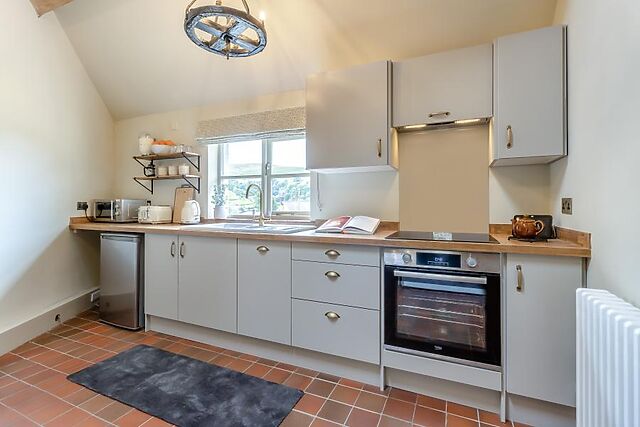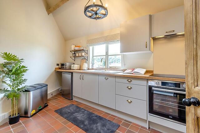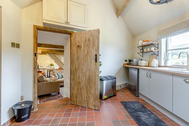 Up a couple of steps, you'll find the well-equipped country kitchen, complete with an Echo Show to help you discover and prepare delicious local Welsh dishes, all while enjoying views of the surrounding countryside. Leading off the kitchen, you'll find a stylish, contemporary shower room.