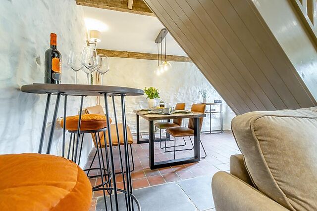 Follow the wooden staircase up to the first floor, where two charming bedrooms await sleepy heads. The spacious king-size bedroom and the cosy twin room both offer plenty of built-in storage and crisp, fresh linens.
