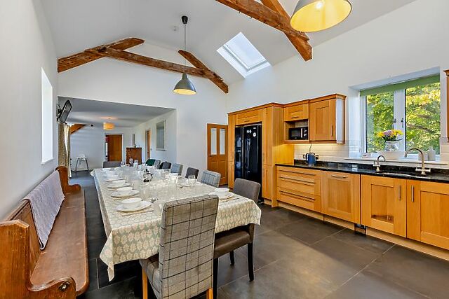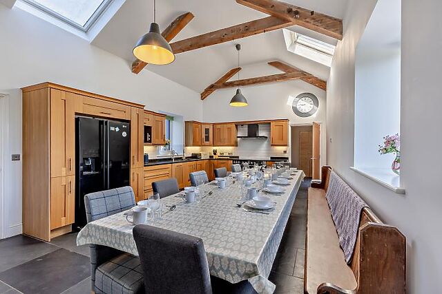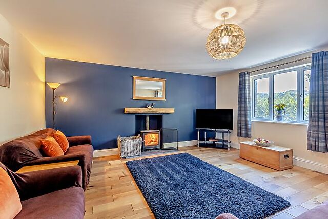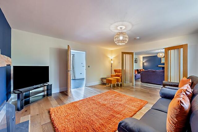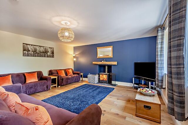Two spacious living rooms with Smart TVs and wood burners provide cosy spaces for movie nights.