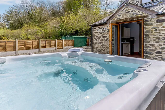 Yes, the accommodation features a private hot tub located in the shingled garden, offering guests a luxurious spot for relaxation and enjoyment amidst panoramic countryside views.