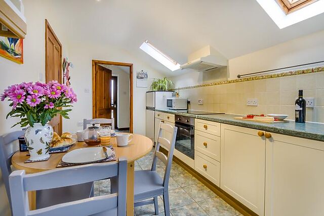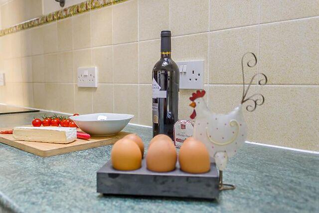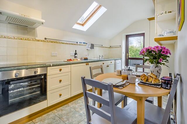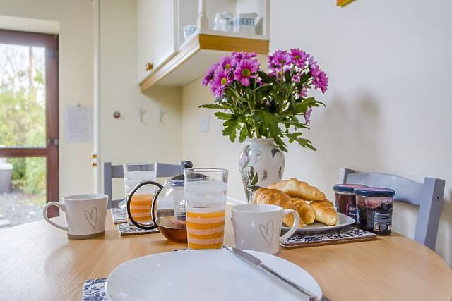 Step into the inviting lounge, where country chic decor and quirky accessories create a warm ambiance. Enjoy evenings by the woodburner, playing board games or simply unwinding. The kitchen is well-equipped for preparing home-cooked meals, which you can savour at the four-seater dining table.