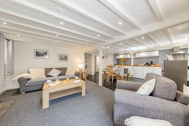 At the heart of the room there’s a dining table perfect for romantic meals which you can cook in the generous, thoughtfully arranged and fully equipped kitchen. When it’s time to turn in for the night, head through to the light and airy bedroom with a lovely king-size bed and ample storage space.
