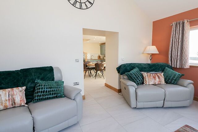 The soaring apex window floods the space with natural light, while patio doors open onto the garden, drawing your gaze to the sweeping rural views beyond. A woodburning stove crackles gently in the corner, promising snug evenings with a book or laughter-filled nights with friends.