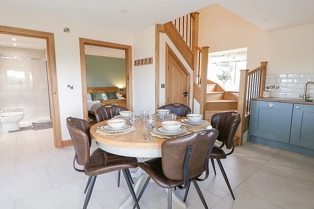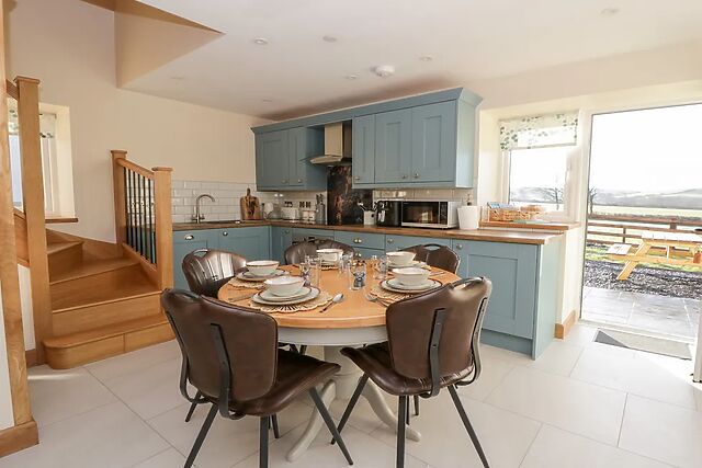 After pulling into the private parking space, Y Stabal immediately captures your attention with its beautifully converted barn design and striking glass apex, perfectly framing the rolling Ceredigion countryside. Step inside and be welcomed by a kitchen/diner that blends rustic character with thoughtful style, where blue fixtures meet warm wooden countertops and cool tiled flooring underfoot.
