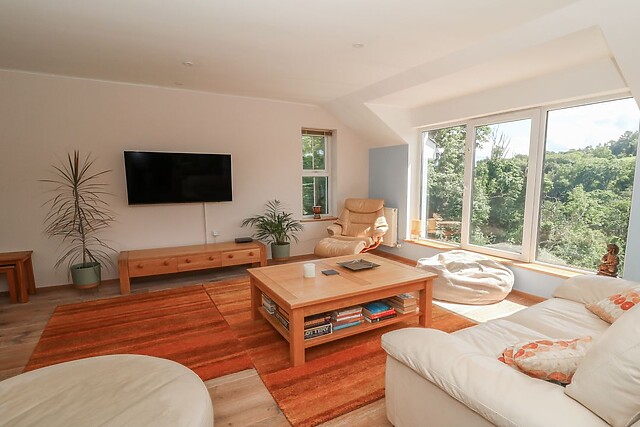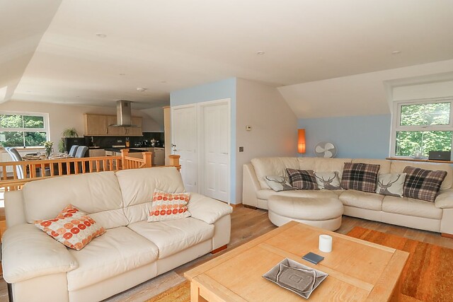 The dining area features large windows that frame the surrounding woodland, creating a tranquil and picturesque backdrop for every meal. After dinner, retire to the sitting room and sink into the inviting seating, flicking on the TV for a relaxing evening in.