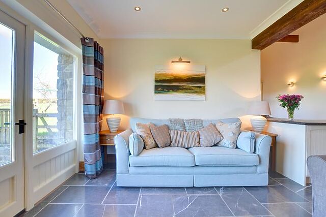 The cottage features an open-plan living space with comfy sofas, cushions, and blankets, creating a warm and inviting environment. The well-equipped kitchen has everything you need to prepare delicious meals. Both bedrooms can be configured as super-king-size beds or twins, offering flexibility for your stay.