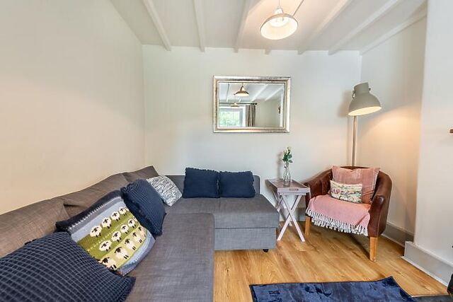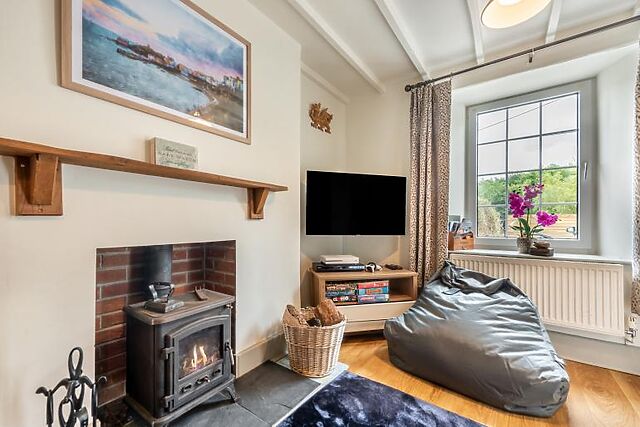 The cottage features a welcoming lounge area with two-seater sofas, a Smart TV, and a wood burner, perfect for relaxing evenings.