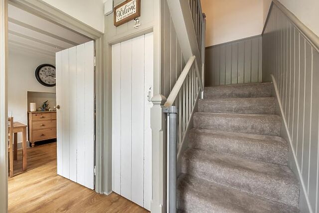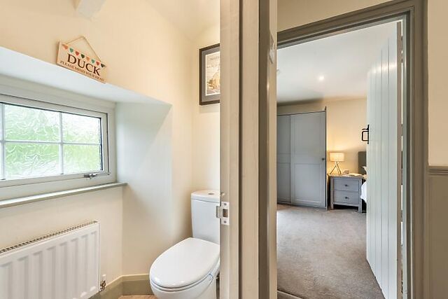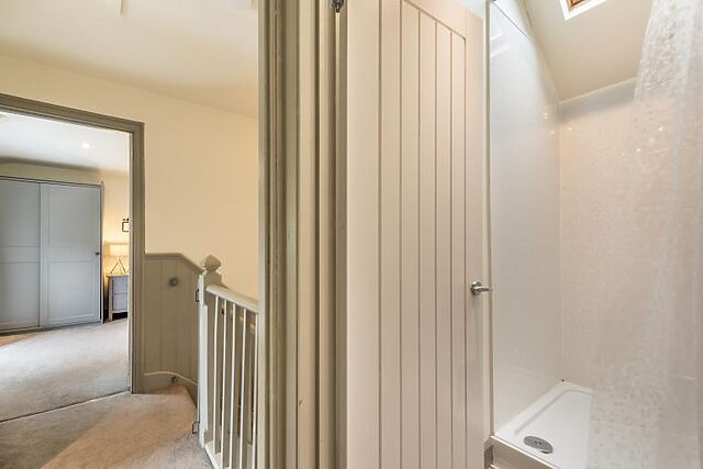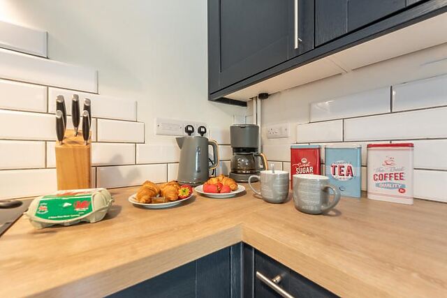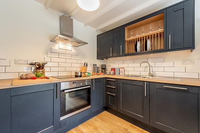 The kitchen/diner is well-equipped with all the essentials, including an electric hob and oven, fridge/freezer, microwave, and dishwasher. There's also a compact dining table with ample space for four people. Upstairs, you'll find the two bedrooms with garden views and a family shower room with a WC.