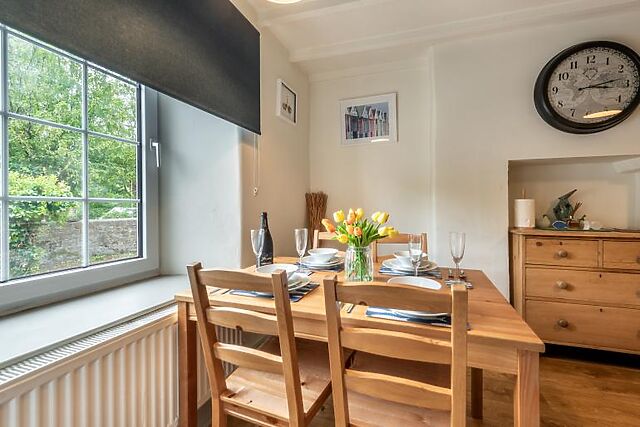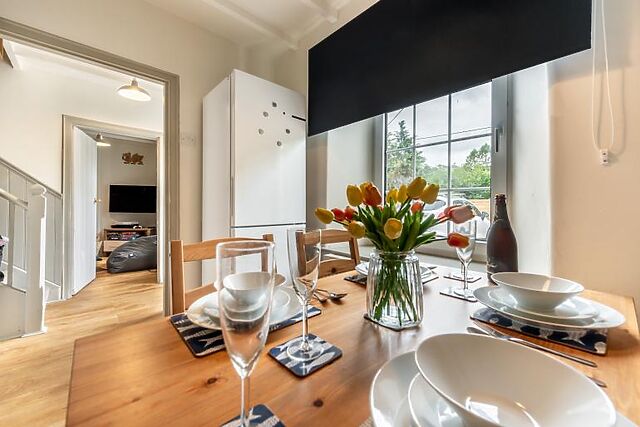 There's also a compact dining table with ample space for four people. Upstairs, you'll find the two bedrooms with garden views and a family shower room with a WC.