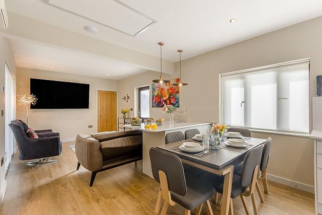 When stomachs rumble, find everything needed in the well-appointed kitchen to cook up holiday feasts, which can be enjoyed at the central dining table or up at the breakfast bar if numbers are low. When it’s time to call it a night, retire to a choice of two inviting king-size bedrooms, both offering relaxing decor, plush linens, and served by the family shower room.