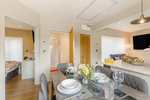After days full of Welsh adventure, retreat to the property’s social heart – the open-plan lounge/kitchen/diner. This homely space is perfect for unwinding thanks to the lounge area’s soft seating, Smart TV and roaring wood burner – ideal for cosy movie nights.
