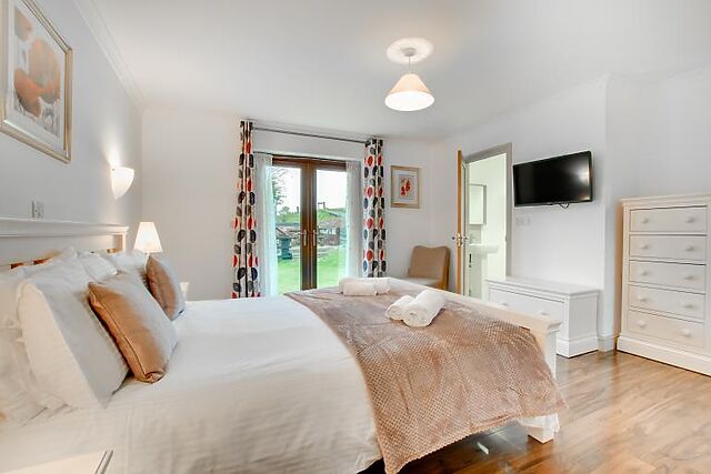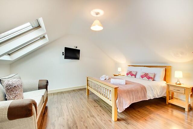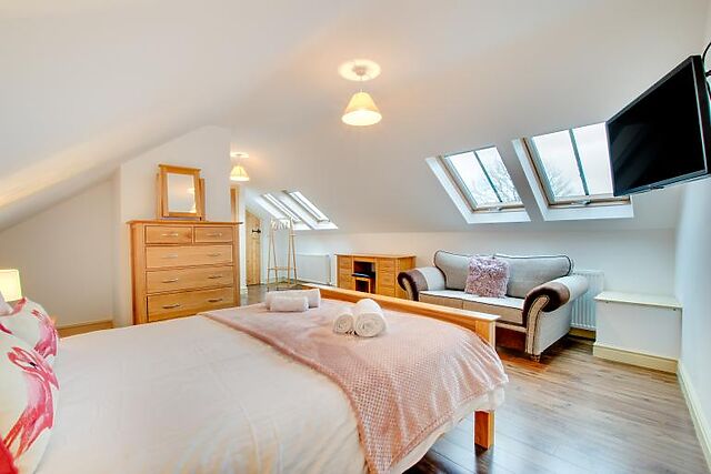 The ground and lower ground floors house most of the sleeping quarters, including a twin bedroom and two en-suite rooms. The top floor features a king-size bedroom with its own en-suite, TV, and sofa.