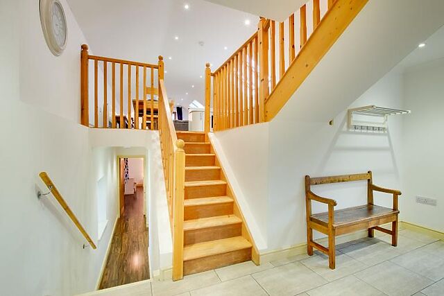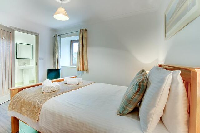 Spread across four storeys, Cwm Hyfryd is designed to provide comfort and relaxation. The ground and lower ground floors house most of the sleeping quarters, including a twin bedroom and two en-suite rooms. The top floor features a king-size bedroom with its own en-suite, TV, and sofa.