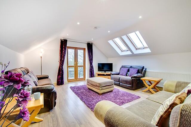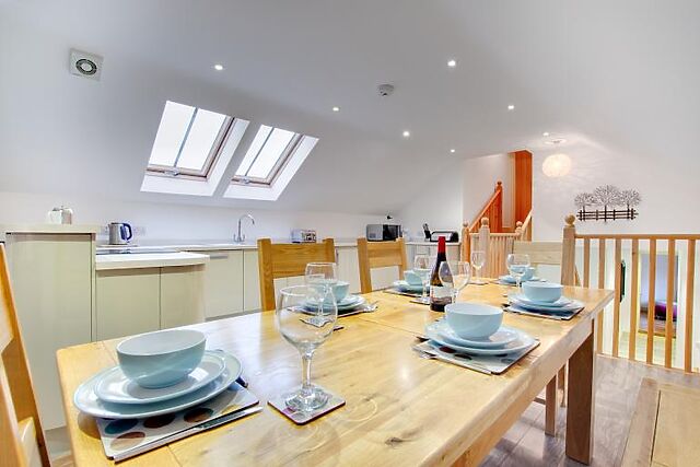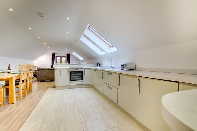 The first-floor lounge/kitchen/diner is a bright, open space with skylights and spotlights. It’s equipped with leather sofas, a Smart TV, and a contemporary kitchen with all necessary appliances.