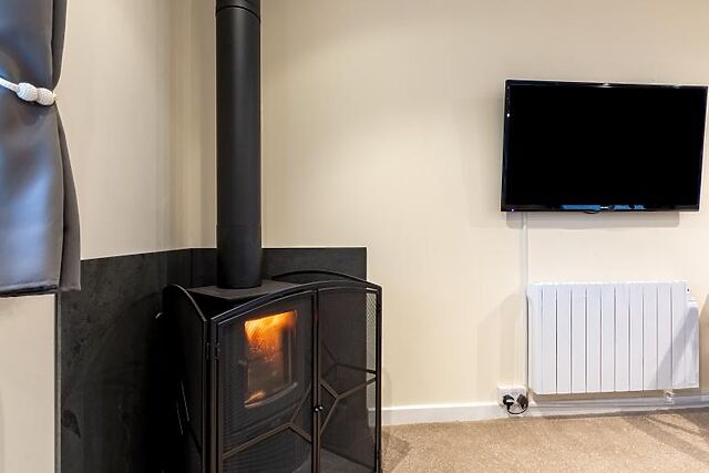 The single-level accommodation features a bright, south-facing open-plan living area with a comfortable corner sofa and a log burner, ideal for cosy evenings.