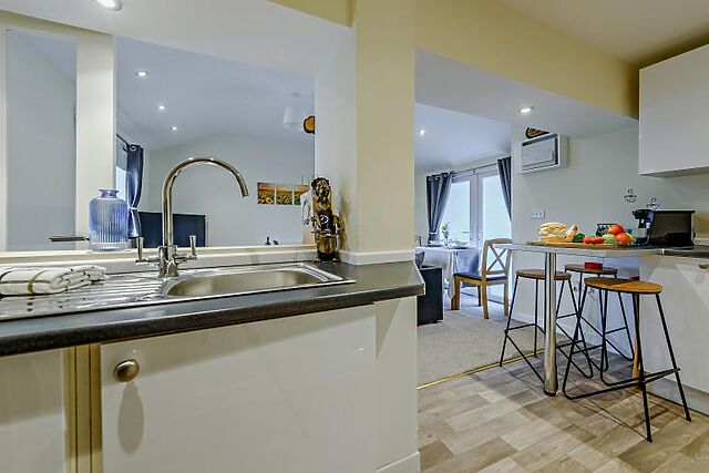The single-level accommodation features a bright, south-facing open-plan living area with a comfortable corner sofa and a log burner, ideal for cosy evenings. The well-equipped kitchen has everything you need for self-catering, and the spacious double bedroom comes with an ensuite shower room.