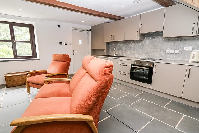 The cottage boasts an inviting open-plan living space complete with a well-equipped kitchen, dining area, and cosy sitting area, all warmed by a woodburning stove.