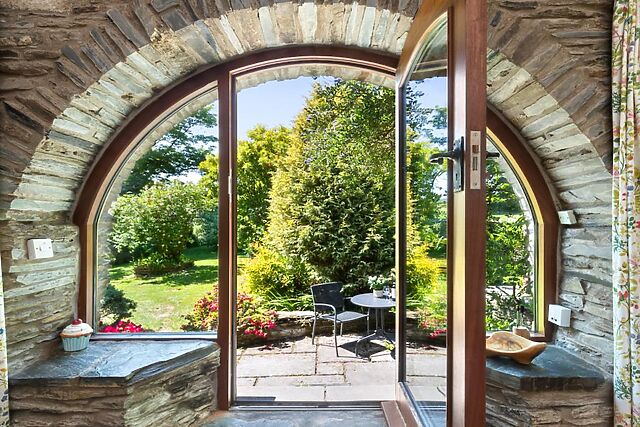 The holiday home is located on a tranquil, exclusive site and guests have shared access to a heated indoor swimming pool, sauna, and hot tub. Slate steps lead to the idyllic converted barn and, inside, the rustic hideaway is bursting with character, with striking slate walls, exposed beams, and original arched windows and doorways.