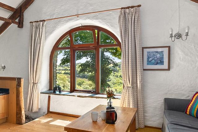Follow the wooden staircase to the first floor where more visual delights await – the open-plan living space really makes the most of the barn’s reverse-level layout, offering stunning views over the valley below. Stretch out on the sofa and turn on the TV for home-style entertainment with the door open for a breath of fresh air or – in cooler times – light the wood burner to toast your toes.