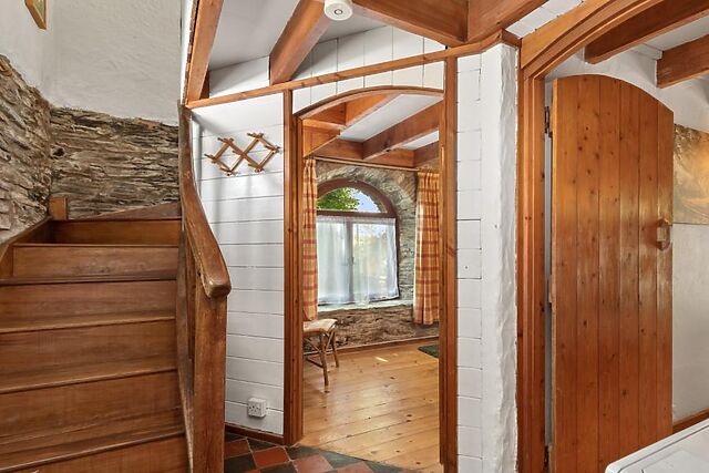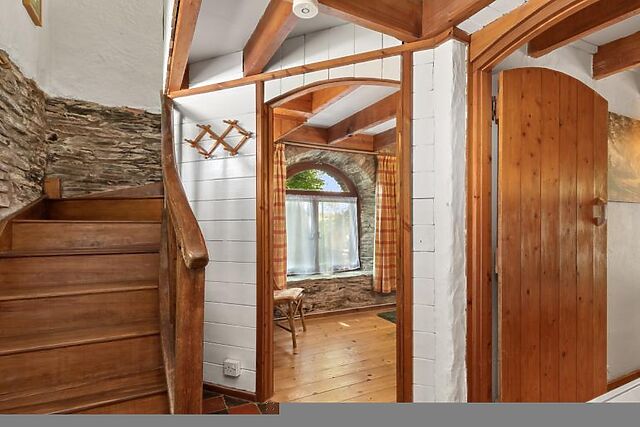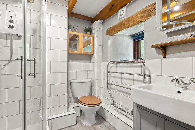 Step inside and a double and a single bedroom occupy the ground floor, along with a contemporary shower room. Exposed beams, wooden floors and stone walls confirm the heritage of the building.