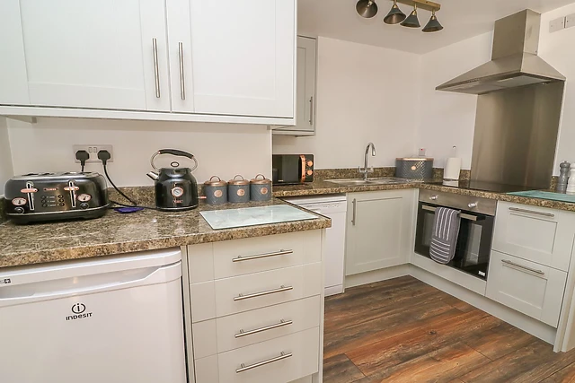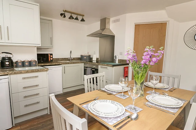 Step into the property to be greeted by a well thought out, open-plan living room, which makes the most of the space, with lovely dark wood flooring and a neutral colour scheme with splashes of grey and mustard. The sitting room offers a corner sofa that the whole group can relax on while enjoying the view of the garden from the patio door or being entertained by something on the TV, while the dining table can comfortably seat the whole group and you can enjoy delicious meals together, prepared in the well-equipped kitchen.