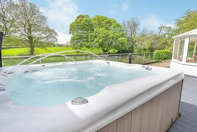 Yes, the accommodation features a private hot tub located on the spacious patio, offering guests a relaxing spot to unwind and enjoy the picturesque views of the surrounding countryside.
